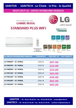 LG UNITES INTERIEURES MURALES PUISSANCE PRIX NET HT ECO TAXE HT